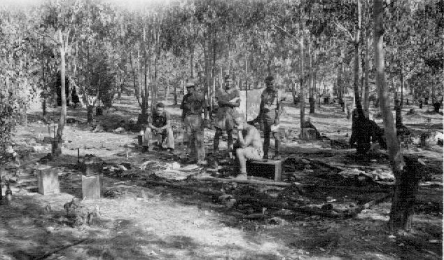 the disconsolate men in this photo are Harry Clare's mates, viewing the ashes of their formerly-comfortable tent